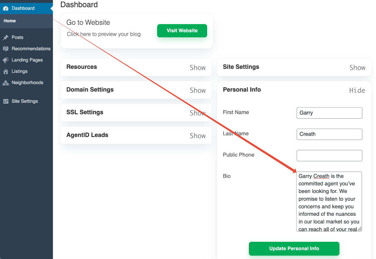When you have edited your bio to your liking, click 'Update Personal Info'. Please allow up to 30 minutes for your new bio to appear on your AgentID Site.