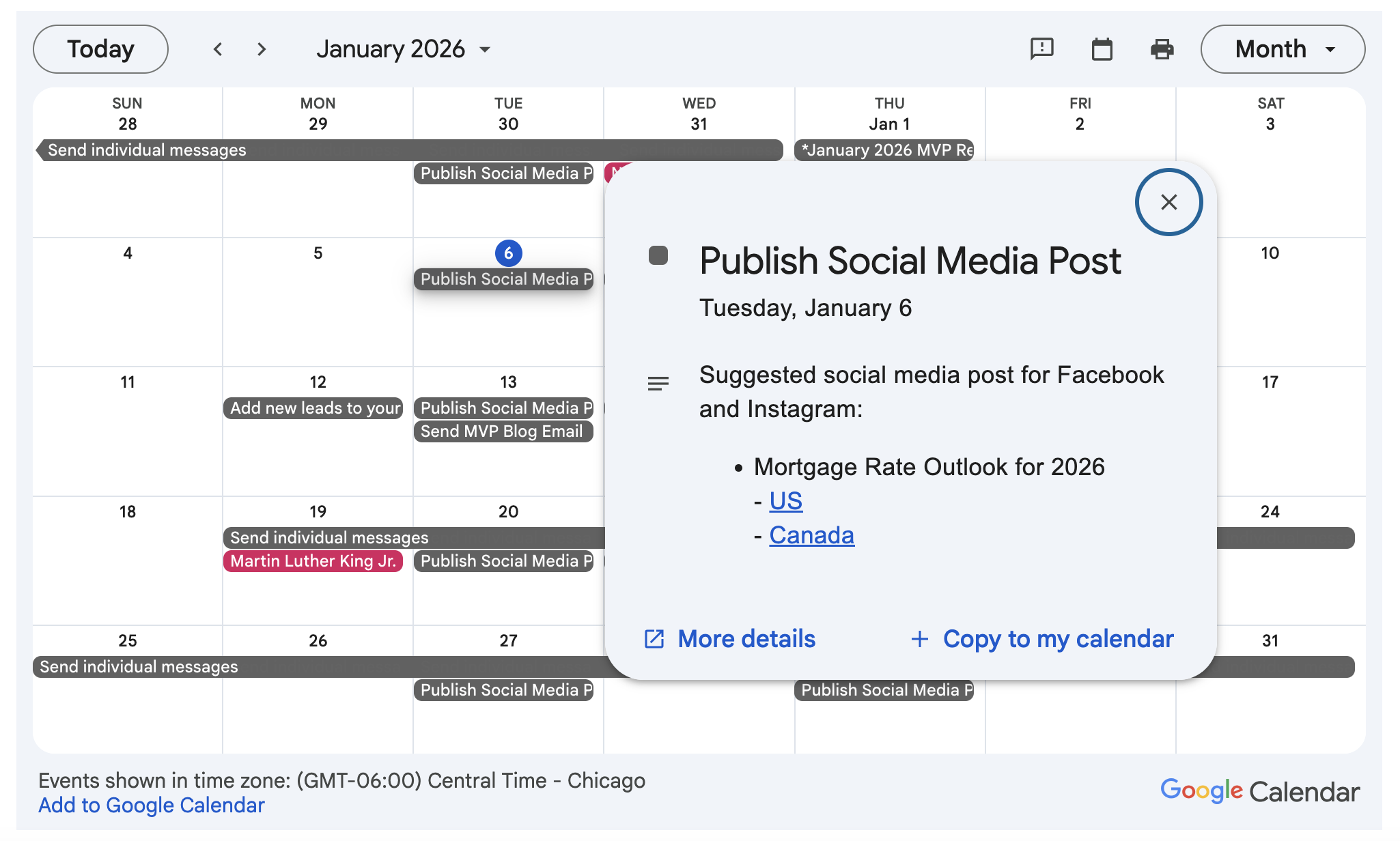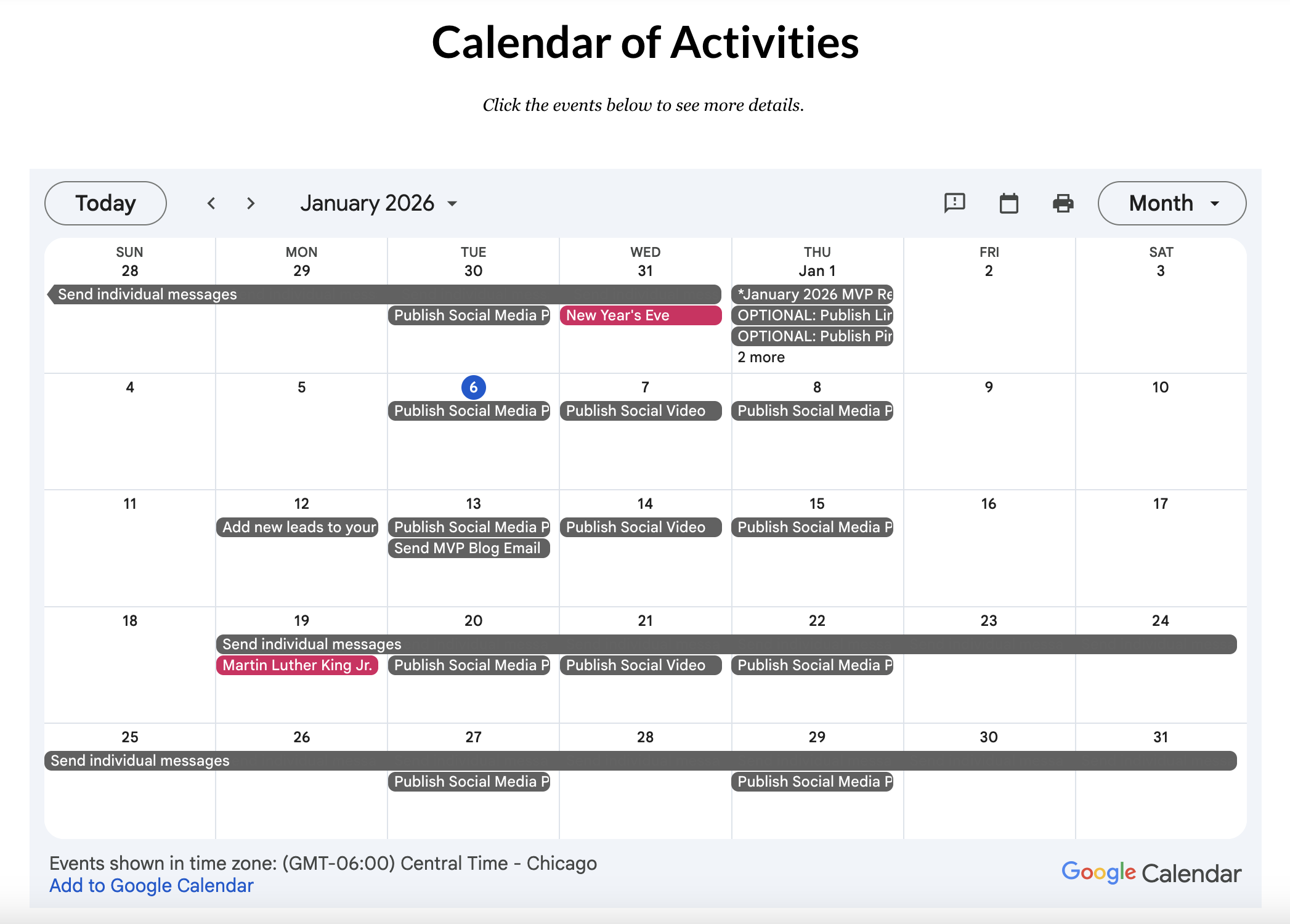For each Monthly Value Program, we include a Calendar of Activities so you can be sure to implement all the components of the MVPs with maximum effectiveness. This calendar is available as an interactive Google calendar, which you can print to PDF or sync with your calendar.